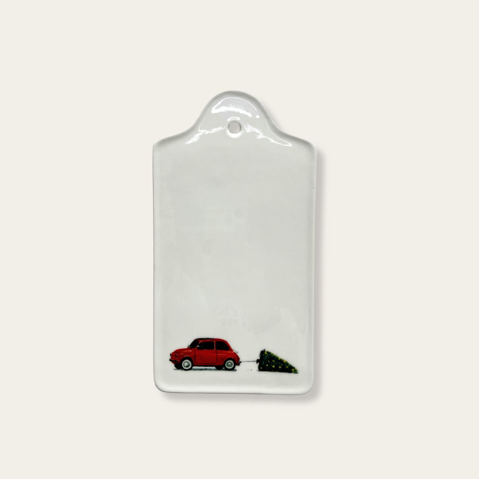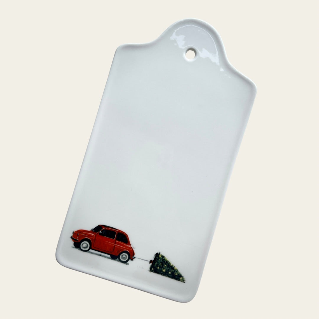 Meet your new favorite holiday companion: a porcelain cheese platter featuring the adorable red Fiat 500 joyfully hauling a Christmas tree across its surface.