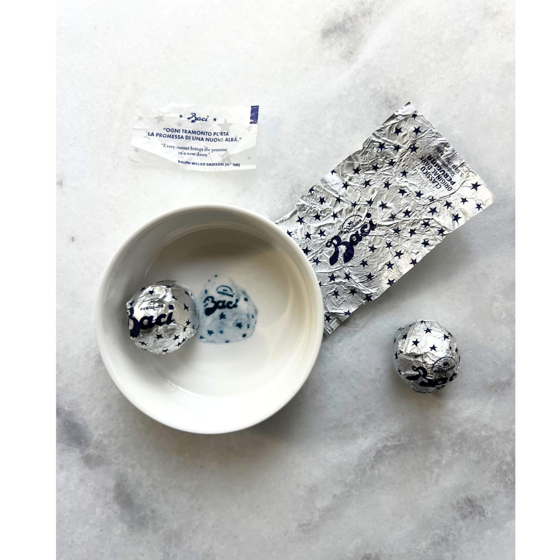 Add a kiss of Italian nostalgia to your table with this small porcelain bowl featuring my illustration of the iconic Baci chocolate by Perugina — foil-wrapped, hazelnut-filled, and famously wrapped with a love note. Perfect for serving little treats, tea bags, or simply adding a playful touch of la dolce vita to your kitchen or coffee table.